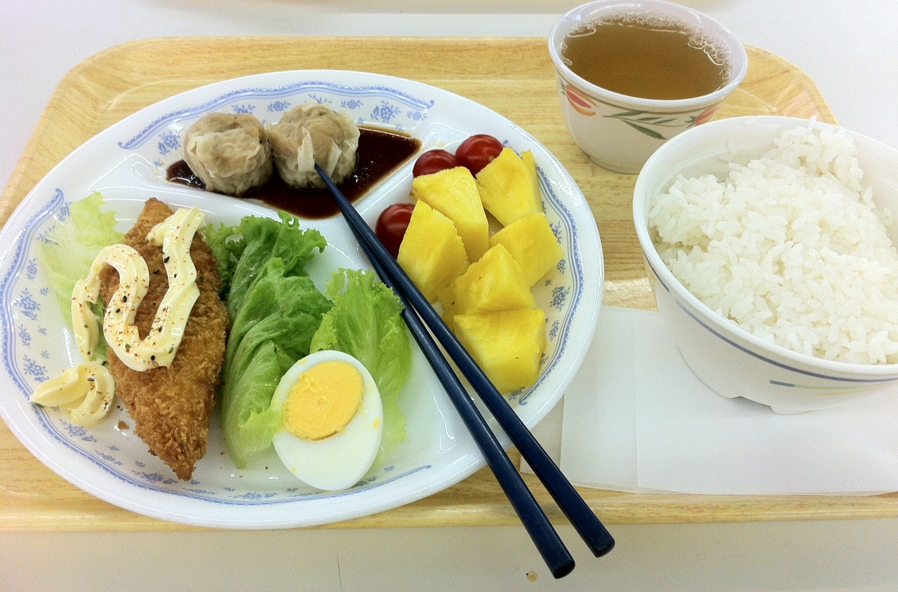 I've blogged about the "new" cafeteria in school where they serve food "buffet" style. It is eat all you can, but it's not a "buffet" in the original sense of the word because you pay as much as you eat as opposed to paying a fixed price. I've also referred to this as the "by-the-pound" ( or "by the kilo") cafteria. If I'm not mistaken, it's 1 yen for every 0.5 grams (0.001 lbs), or maybe the other way around. The plain, steamed rice has a different unit price though. I was too early to get one of my faves, roasted chicken, so I settled for this plate of white fish fillet, a couple of shuumai, half a boiled egg, and my usual lettuce bedding, tomatoes, and pineapples for dessert. I was a bit generous with the mayo as you can see. It is Japanese-style mayo, which is kind of tasty and a little bit sweet. I did find a new use for this mayo - as a dip for the pineapples. Yummy. I was also a little generous with the rice, and this cost me around 550 yen in total. As always, the tea is free and it's free to refill any number of times. I should add that my Mainland-Chinese colleagues here call the shuumai as "Japanese-style," because up there they have bigger ones that are packed with some rice as well that make them full meals by themselves, maybe usually for breakfast, or as a really heavy snack or a quick hunger-stopper. Of course, to us in Southeast Asia and maybe even in HK, this certainly looks like a typical Chinese shuumai and not "Japanese-style," but it is maybe more like Southern China style as opposed to the bigger ones being Northern China style. Taste-wise, to me, it's just about right for something that's not served at a fancy authenthic Chinese restaurant. If these were sold in the Philippines, they would probably be 40 to 60 pesos for four - it's that much better than the street/kiosk shomai we get for 30 pesos or less.